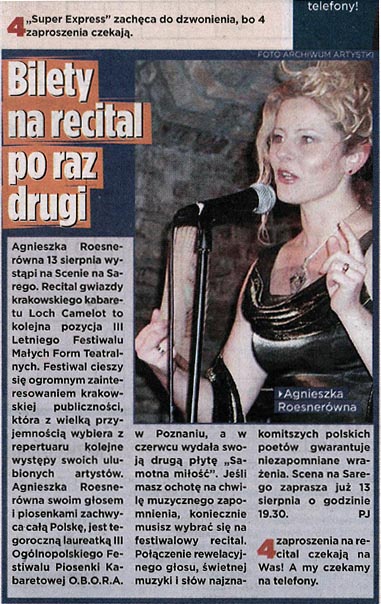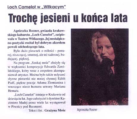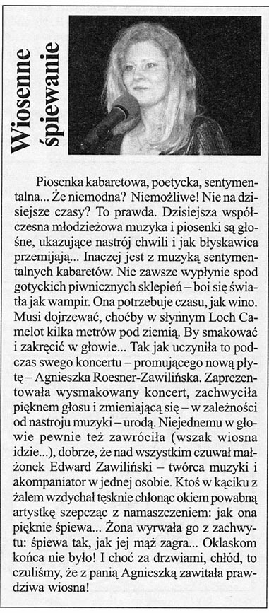 www.varsoviana.net i Samorządu Mniejszości Polskiej V. dzielnicy Budapesztu, w dniu 4 października 2008 roku przybyła z Krakowa para artystów członków kabaretu Loch Camelot, którzy wystąpili z recitalem liryczno-kabaretowym. Wszytko to miało miejsce w siedzibie Polskiego Stowarzyszenia Kulturalnego im. J.Bema, który był współorganizatorem koncertu. Przybyłą Polonię powitała przewodnicząca SMP V. dzielnicy Budapesztu Jadwigi Abrusán zapraszając do występu gości z Polski, piosenkarkę Panią Agnieszkę Rösnerównę oraz Pana Edwarda Zawilińskiego kompozytora większości przedstawionych piosenek, który akompaniował, śpiewał i prowadził program.. Szeroki i urozmaicony program oraz osobowość Pani Agnieszki wytworzyła wspaniałą atmosferę na sali. Dzięki temu publiczność polonijna mogła poznać doskonałe walory aktorskie i sceniczne piosenkarki.