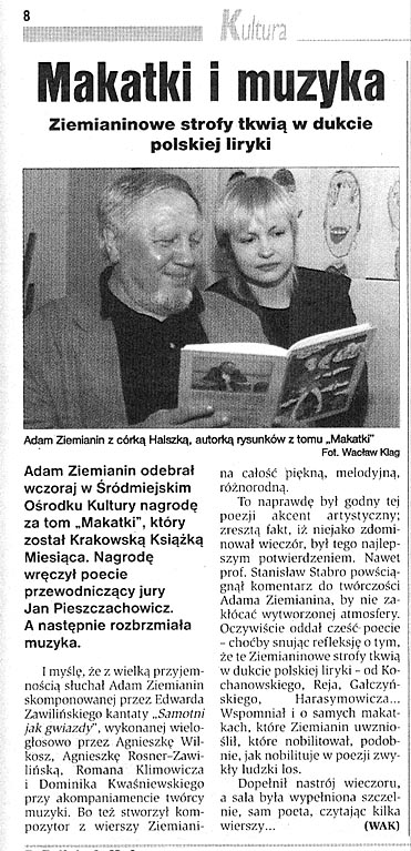 W pierwszej części programu powtórzono najlepsze piosenki z poprzednich występów. Anna Gądek jako Frania z miotłą awansująca do prawej ręki " szefa", satyrycznie i trafnie pokazała los Polek na emigracji. Niektóre, bardzo nastrojowe piosenki wykonała Teresa Ligęza-Krasnowski. W czasie występu śpiewano teksty poetyckie autorów: doc. ks. Bonifacego Miązek, Ewy Dan i Jadwigi Wójcik. Skecze w wykonaniu Bogusławy Haase i Elżbiety Akwa-Asare pokazane z dużym wdziękiem i temperamentem, rozbawiły na dobre szczelnie wypełnioną Piwnicę polonijną publicznością. Występy Kabaretu "E" oklaskiwali także goście honorowi z konsulatu: radca-minister Tadeusz Oliwiński i konsul Andrzej Kuźma z małżonkami, doc. ks. Bonifacy Miązek ze swoimi studentami Slawistyki, prof. Grażyna Dyląg oraz autorzy tekstów piosenek. Swoistego uroku dodał Kabaretowi "E" gościnny występ młodej, utalentownej skrzypaczki z Warszawy Joanny Kaniewskiej, przebywającej w Wiedniu na stypendium u znakomitego skrzypka Akademii Muzycznej prof. Edwarda Zientkowskiego. W jej wykonaniu brawurowo zagrany"Obertas" Henryka Wieniawskiego przy akompaniamencie Marka Kudlickiego na fortepianie, znanego pianisty i organisty oraz inne improwizacje bardzo podniosły poziom występu Kabaretu. Publiczność nie szczędziła braw dla profesjonalistów i amatorów. Niespodzianką był występ piosenkarki kabaretowej Agnieszki Rösner z Edwardem Zawilińskim grającym na fortepianie i akordeonie, znakomitych artystów z kabaretu "Loch Camelot" z Krakowa. Powiało krakowską tradycją kabaretową, a każda z piosenek w świetnym wykonaniu aktorskim Agnieszki Rösner zachwyciła wymagającą wysokiego poziomu publiczność. W Kabarecie wystąpili także muzycy soliści i akompaniatorzy, na fortepianie grała Krystyna Krynicka, na organach elektrycznych - Adam Jasik obchodzący właśnie swoje 52-letnie urodziny. Solo na fortepianie grał Tadeusz Leśniakowski. Na zakończenie odśpiewano wspólnie z publicznością polską kolędę "Bóg sie rodzi, moc truchleje..." a choinka z lampkami wprowadziła nas w świąteczny nastrój zbliżającej się "Wigilijnej Gwiazdki". Pojaśniało nam swojską polskością.... Jeszcze długo nie mogli rozstać się rozbawieni polscy emigranci, świętowano urodziny, improwizowano wspólne śpiewy i fortepianowe popisy. W sumie występ Kabaretu "E" to była świetna zabawa, dużo śmiechu, humoru i dobrej muzyki w wykonaniu nie tylko amatorów ale i profesjonalistów. Należą się słowa uznania dla wszystkich wykonawców na czele z Adamem Turczyńskim i organizatorów występu Kabaretu "E". Z życzeniami dalszego pomyślnego rozwoju i coraz lepszego poziomu oraz Wesołych Swiąt i Szczęśliwego Nowego Roku dla wszystkich Rodaków ! Dr Janina Osses-Frei, Wiedeń, 18 grudnia 2004 r. ![]() Wiadomość i zdjęcie pochodzą ze strony: http://polonia.pap.com.pl |