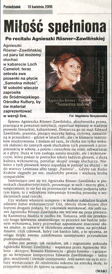 W programie nie brakuje klasyki polskiej ( J. Tuwim, B. Leśmian, M. Hemar) i zagranicznej ( Cwietajewa, Wertyński, Piaf). To w Krakowie, a ja po obejrzeniu jej budapeszteńskiej "Samotnej miłości" stwierdzam, że Agnieszka Rösnerówna owszem jest aktorką i to niezłą, doskonale wciela się w przeróżne postaci od kobietki naiwnej, flirtującej z sobą i z życiem, po drodze spotykając na przykład "babę" spod Myślenic, po kobietę dojrzałą, wampa, absolutną gwiazdę, obiekt westchnień i niespełnienia wielu mężczyzn. A przy tym wszystkim orgromna doza humoru, liryki i piękna. Spektakl znakomicie dopełnia mężczyzna (prywatnie mąż Agnieszki), który poza grą na fortepianie również śpiewa, a robi to nie byle jak, doskonale oddając klimaty Wertyńskiego, a przede wszystkim niepowtarzalny klimat sentymentalnej, "jesienniejącej na jesień" miłości. Nadzwyczaj przedni był to pomysł zaprosić tę niecodzienną parę artystów do Budapesztu, a jak się dowiadujemy ze źródeł półoficjalnych być może zawitają oni do nas ponownie już w grudniu tego roku. Oby się tak stało! (b.)- Bożena Bogdańska-Szadai |